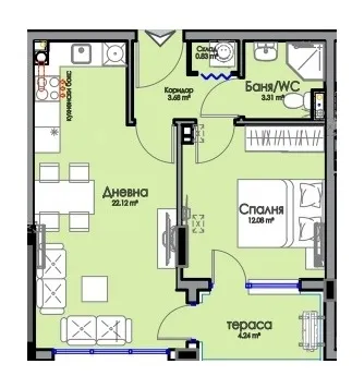 | Вид на имота | Двустаен апартамент | Площ | 61.48 |