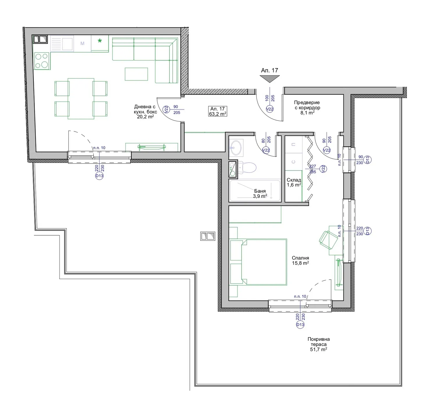 Жилищната сграда е проектирана по високи стандарти, с модерна архитектура и внимание към всеки детайл. Висококачествените материали и функционалното разпределение на апартаментите гарантират комфорт и удобство за бъдещите собственици.